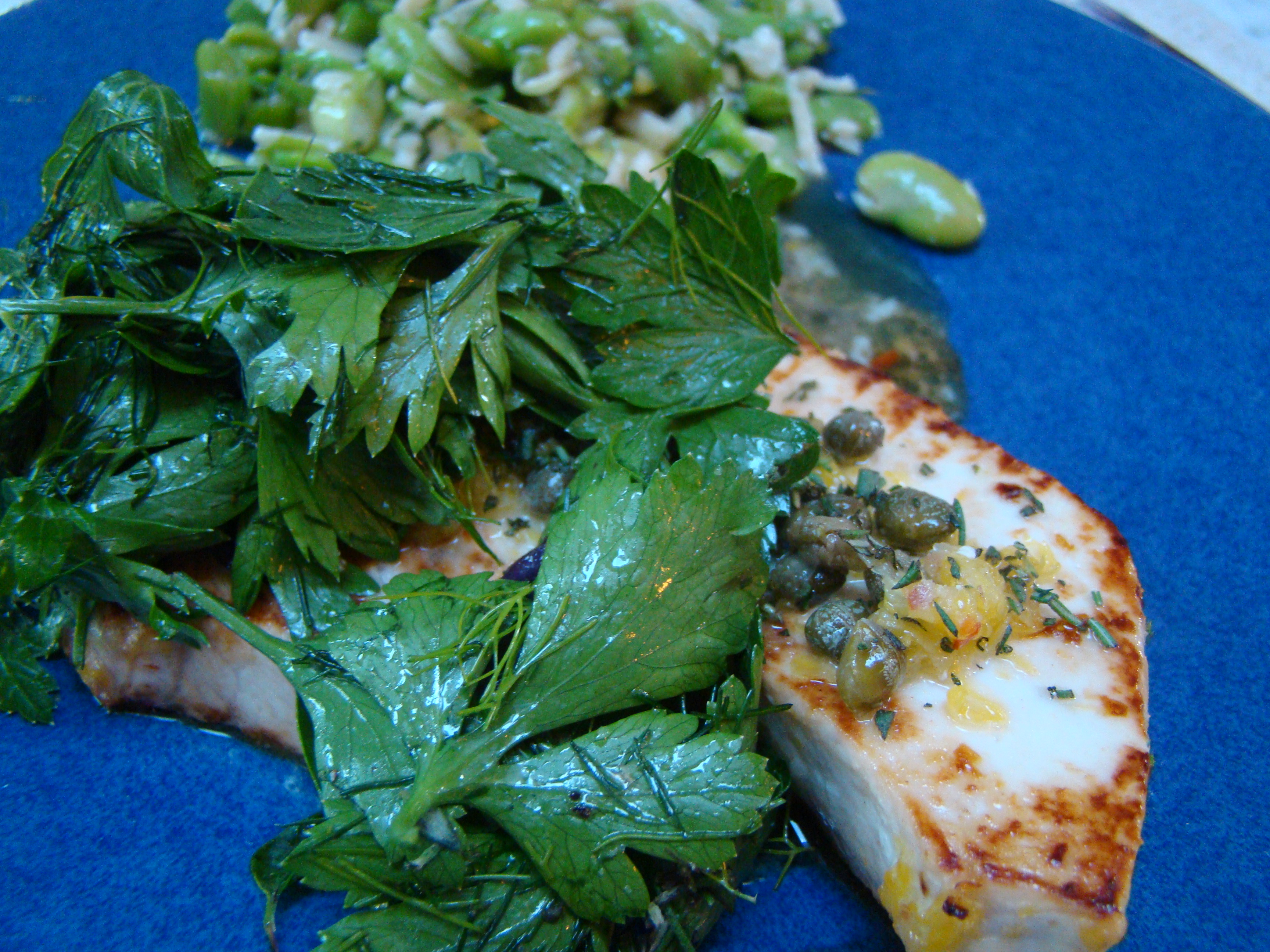 Just before serving, the herbs are tossed with a little olive oil and lemon juice. The fish is topped with sauce, and then the herb salad, which makes an impressive plating. I made a fava bean salad to fill out the plate. More on that later this weekend.