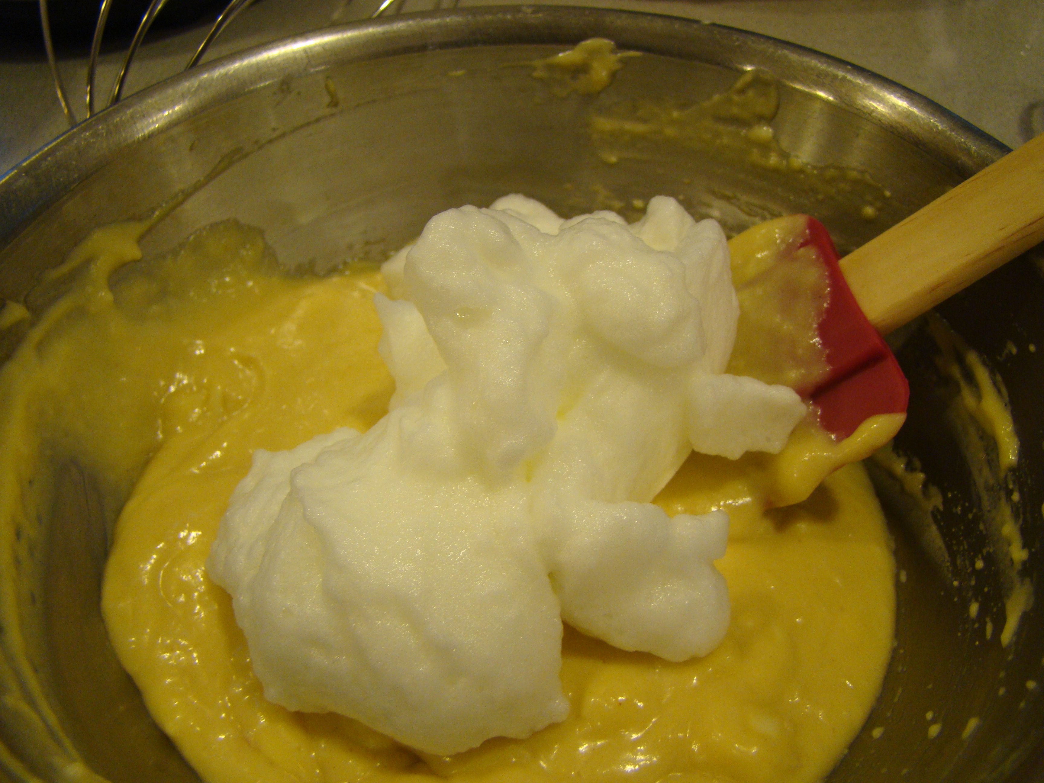 For the soufflé, you start by making a thick bechamel sauce, seasoned with ground cumin. Then you whisk in egg yolks and stir in diced Munster. Finally, the egg whites are beaten until they are firm, then folded into the cheese mixture. Cheese soufflés have a reputation for being difficult to make, but I found it to be relatively easy.