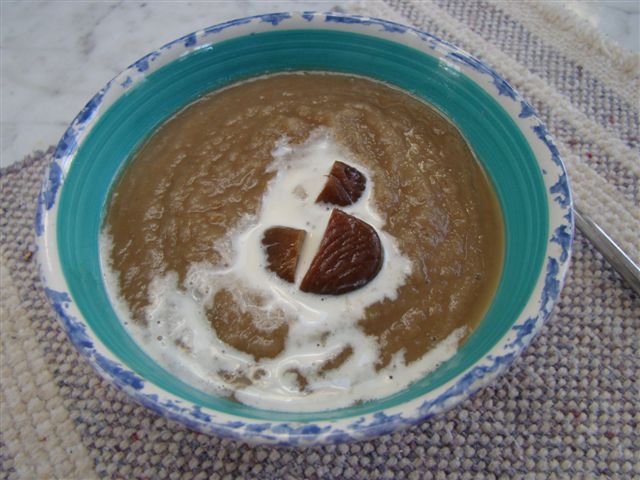 Chestnut-Pear Soup made a perfect autumn lunch. It would also make an elegant starter to a special (or even an everyday) meal. I topped the soup with a splash of cream and a quartered chestnut and enjoyed my lunch. I’m hoping it freezes well. I was the only one eating it this week, so put a few containers in the freezer for later.