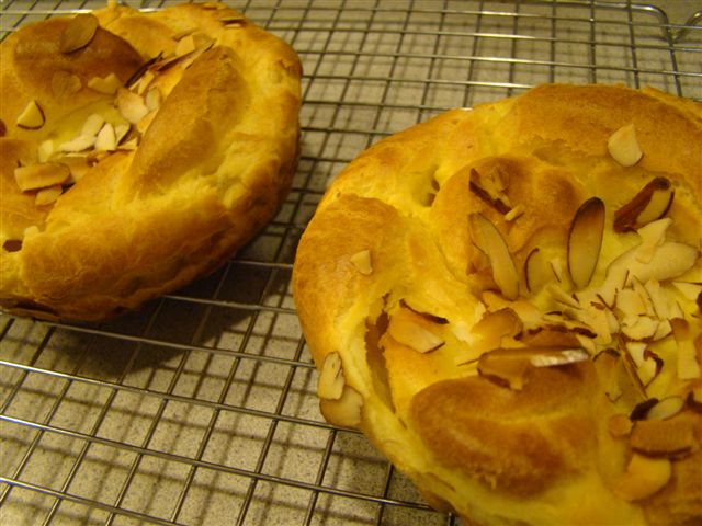 First, I set out to make the caramelized almonds that flavor the pastry cream. I didn’t have any whole blanched almonds, only slivered, which have a whole lot more surface area than whole ones. I decided to double the caramel to be sure to have enough coating. It worked out perfectly. Wow! Those caramelized almonds were delicious. We, Howard and I, could have nibbled on the whole batch. The almonds even sparked his interest enough that I varied my plan and made two rings so Howard could try Paris-Brest too.