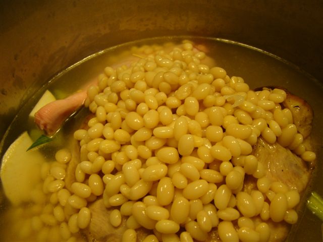 This is the kind of soup that’s best prepared on a lazy afternoon. You start by soaking some little white (Navy) beans. Then, you brown a pork shoulder. That’s when I realized my large Dutch oven wasn’t going to be big enough for the batch of soup, so I switched over to the giant stock pot.