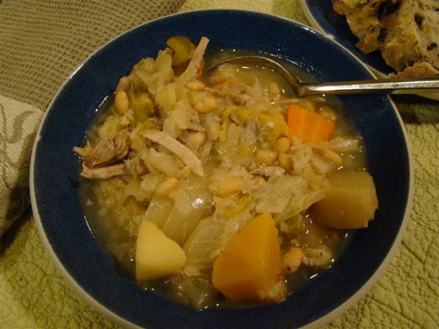 A variety of alliums (onion, leek, shallots AND garlic) are sautéed before adding big chunks of carrots, turnips, potatoes, and celery, the browned pork shoulder, a duck leg, the beans and lots of liquid. I used just 1 quart of chicken broth diluted with water because I felt the ingredients would add enough flavor. Oh, and I can’t forget the cabbage, piles of shredded cabbage. This simmers for an hour before adding some sliced sausage.