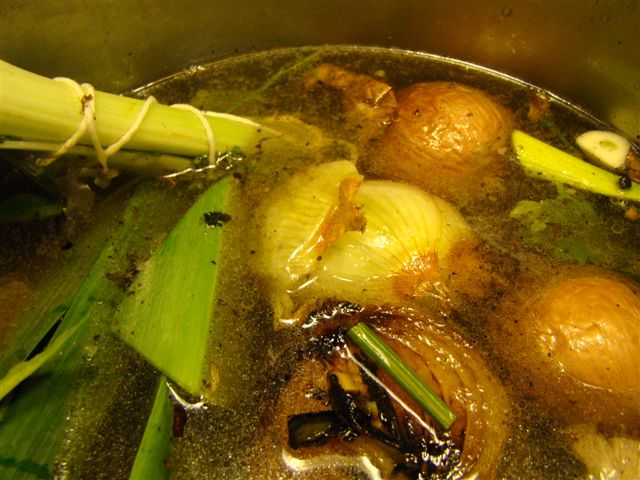 To make dinner, I simmered an assortment of vegetables, most of which I had in my mini root cellar in the basement (i.e. a big plastic container filled with sand next to the drafty door) in the bouillon.