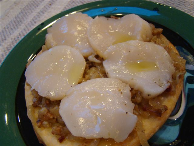 Finally, the scallops. I’ve never seen them as expensive as they were this week. I nearly fell over when I saw them priced at $28.99 a pound. I was only making half the recipe, so I asked for three scallops (they were huge), which ended up weighing just under half a pound for $11. Even though I trust the freshness of Whole Foods seafood counter, I seldom keep uncooked fish in my refrigerator overnight. I’m a “eat it the same day I buy it” seafood shopper. I mixed up some dates this week, so ended up buying the scallops two days before I actually needed them. This made me squeamish about eating them raw (OK, barely cooked). Instead, I seared the scallops the way we have before, then sliced them into disks to top the mini-onion tarts.