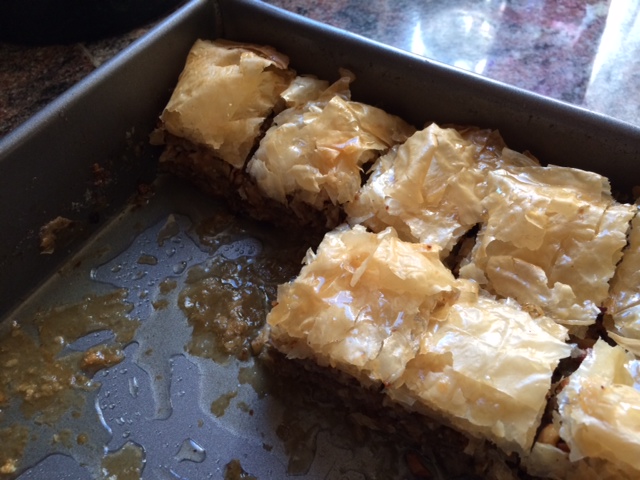 My niece Rachel joined in on the action. We worked as a team. I laid down the phyllo layers, Jennifer brushed each layer with melted butter, and Rachel was in charge of sprinkling the sugary nuts.
