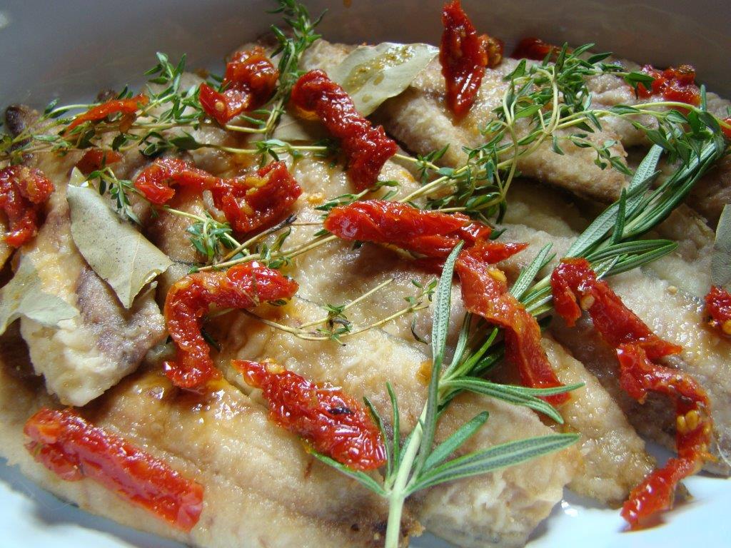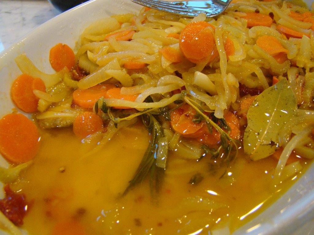 I couldn’t quite imagine what this dish was going to be like as I put it together. The sardine fillets are quickly fried to partially cook them, arranged in a dish, and strewn with thyme, rosemary, bay leaves, and sun-dried tomatoes. Then thinly sliced vegetables (onions, carrots, celery, and garlic) are sautéed and then simmered in olive oil, vinegar and spices (and a little bit of ketchup). The hot vegetable mixture is poured over the fish and chilled overnight.