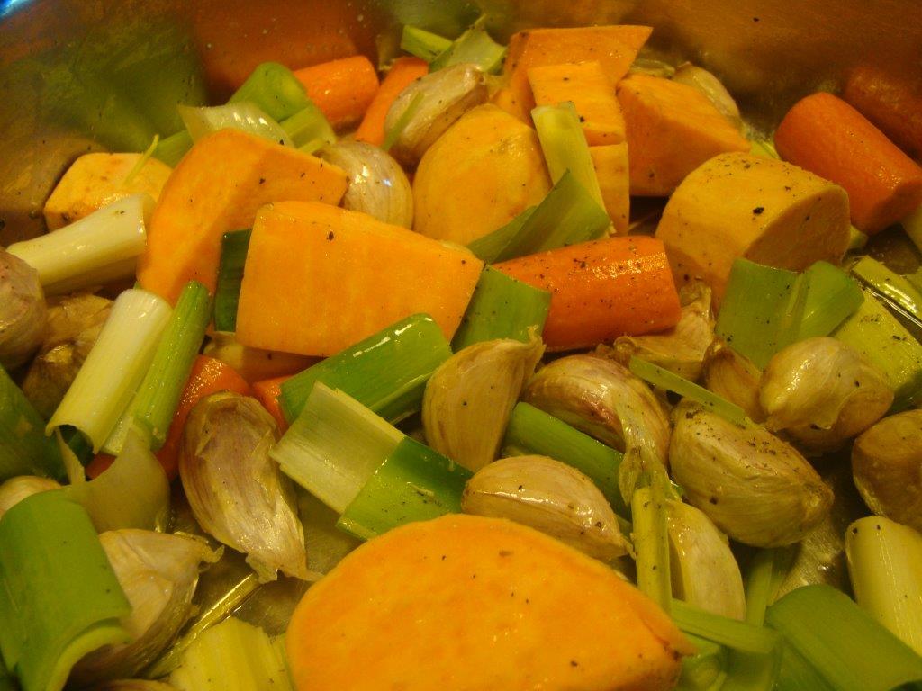 And easy! First, you brown the vegetables. Sweet potatoes, carrots, celery, onions, and FOUR HEADS OF UNPEELED GARLIC broken into cloves! I thought I had baby onions in the freezer, leftover from the Marengo, but I couldn’t find them. I did find two leeks in the refrigerator, so I halved them lengthwise and cut them into 1-inch pieces to stand in for the onions. The vegetables are transferred to a Dutch oven along with sprigs of herbs and some diced preserved lemon. (Did you know that Trader Joe’s now sells sliced preserved lemon in a jar?)