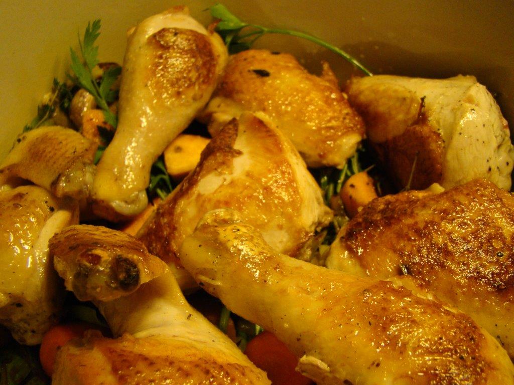 Then, you brown the chicken. I had thawed a whole chicken from the freezer in anticipation of making this version of a “roast” chicken, but when I realized my error, I ended up cutting it into pieces before browning. Much easier to manage on the stove and then the plate. (And there’s the added bonus of sautéed giblets for the dog.) The chicken pieces are nestled on top of the bed of vegetables.