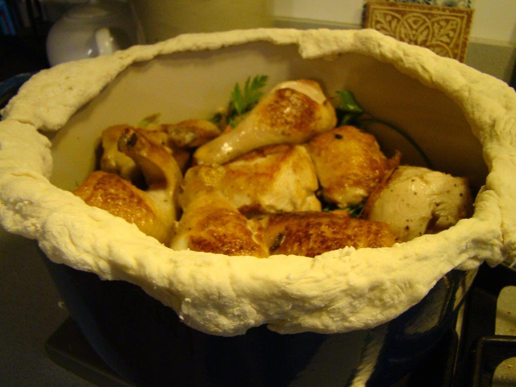Now comes the fun part! You make a simple flour and water dough, sort of like a soft Play-Doh, just like when we were in preschool, and roll it into a long sausage shape. The dough is pressed along the edge of the Dutch oven, and then the lid goes on top. The dough closes the gap between the pot and its lid, sealing in all the moisture as the chicken in the pot cooks in the oven for almost an hour.