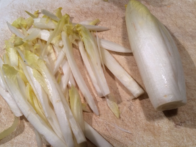 I had some trouble envisioning how to cut the endive.  Cut it lengthwise, then lengthwise again?  I was assuming that all the layers would have fall apart with the first set of cuts. Fortunately, it made more sense as I went along.  Even with the root trimmed off, the first cut yielded slabs that could be cut lengthwise again to create the requisite bâtons.  Voilà!