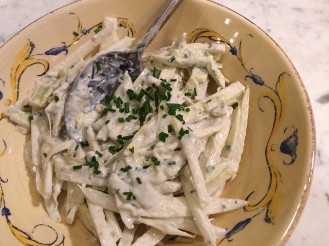 This week, we start off with a Winter Salad.  For this simple recipe, bâtons of Belgian endive are tossed with a thick Roquefort dressing.  Roquefort, a sheep’s milk blue cheese, has a strong yet smooth flavor.  It lacks the metallic aftertaste I find with many blue cheeses.  The bitter greens contrast with the creamy dressing for an interesting salad for this time of year.
