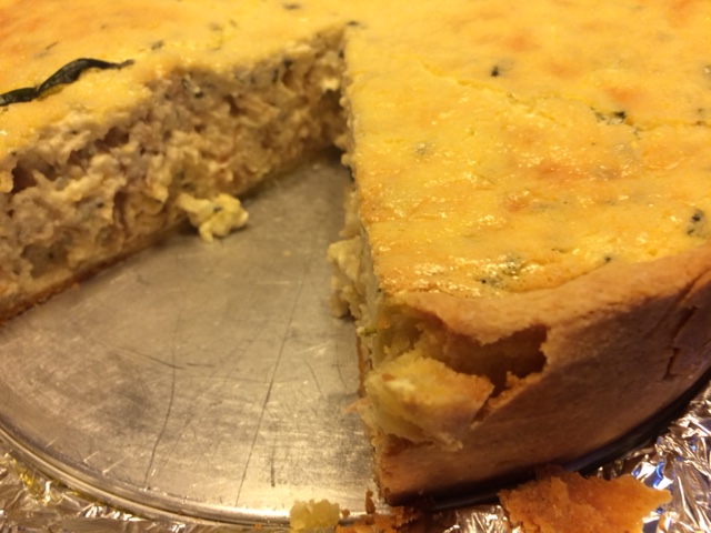 The recipe starts with a sturdy crust made with standard ingredients (flour, butter, salt) plus cornmeal and egg. I usually make my pâte brisée in the food processor, but this crust mixed up easily in a stand mixer. I liked that the crust didn’t require pre-baking, though it wasn’t as flaky as the other crusts I use for quiche.