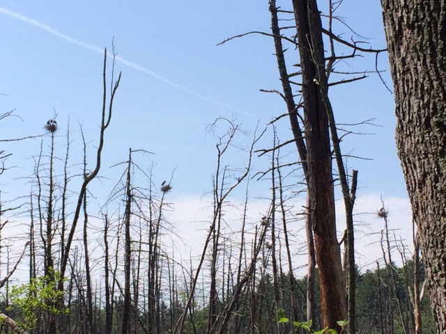 The highlight of my Memorial Day weekend was a short hike in nearby Concord Massachusetts to check out a blue heron rookery.  I occasionally catch one wading in the pond Bella and I walk around every morning.  And I love the prehistoric look of herons flying overhead.  They remind me of pterodactyls.  When my neighbor (hi, Cass!) told me where to find the rookery, I channeled my inner Mary (Hirsch), had Howard find the binoculars, and we went for a ride.