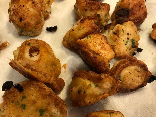 Towards the end, I tried flattening the balls into patties before dipping and frying. I found this to be less frustrating. I’ve successfully converted from pan-frying to baking my crab cakes, so I also wonder whether the batter-coated patties can be baked instead of pan-fried.