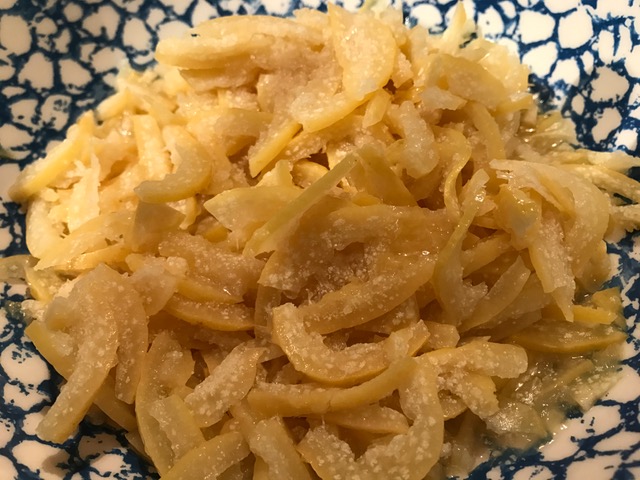 I was hoping to make marmalade with Meyer lemons, but I couldn’t find them, so I started with organic lemons instead. The first step is to cook the fruit until it is tender, then let it cool in the cooking water. Once cooled, the fruit is halved and the pulp is scooped from each half into a bowl, discarding any seeds. A grapefruit spoon does a thorough job at this step. The empty halves are quartered (through the ends) and each wedge of rind is thinly sliced and added to the bowl.