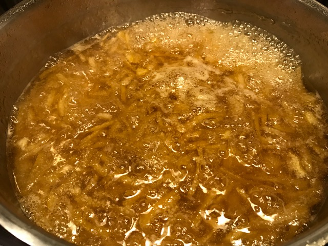 Time to cook it all into marmalade. Based on the 1:1:1 ratio, equal weights of prepared fruit, sugar, and cooking water are combined. I also added some elderflower cordial that I made this summer because I like the way its floral notes complement the tart lemon flavor. The mixture is brought to a boil, then simmered until the marmalade reaches a temperature of 220F and passes the cold plate test. In a wide sauté pan, it took about 25 minutes to perfection. And while the marmalade cooked, I sterilized my jars. When the marmalade was ready, I ladled it into the hot jars and processed for 10 minutes.