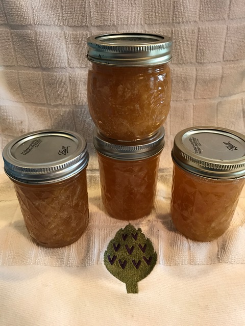 Start sterilizing your jars in a water bath. I like to add an extra jar plus a 4-oz jar just in case the yield is higher than expected. Place a couple of small plates in the freezer.