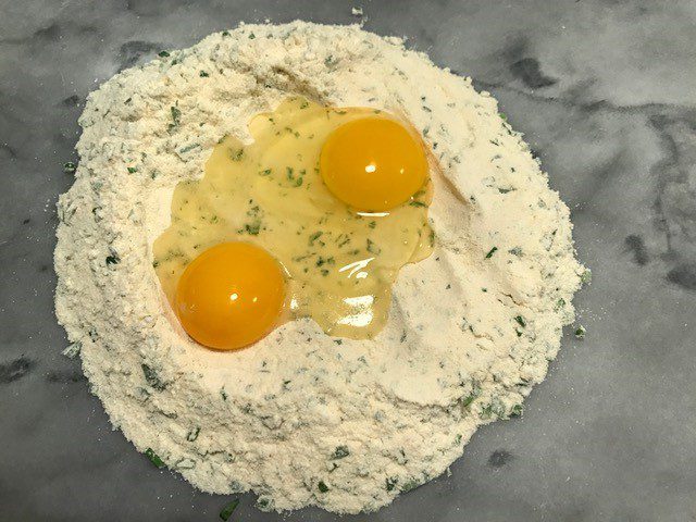 Pasta is not something I ever think to make myself. It seems intimidating, especially when making the dough by hand rather than in the food processor. I was home alone the night I made this, so I made a smaller batch. Always divide by the eggs, so I made 1/3 of the recipe. I used a variety of herbs from my garden and just followed the recipe.