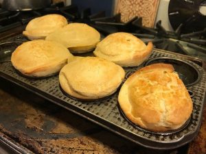 The puffs puffed. What they didn’t do is get all that brown. I’ll admit that the glass window in my oven is not very easy to see through. After 35 minutes, the puffs looked brown, but I think the baked-on splatters disguised the true color. They also were stubborn about coming out of the pan. I used a muffin tin because I don’t have a special popover pan, though I’m not sure it would have made a difference.