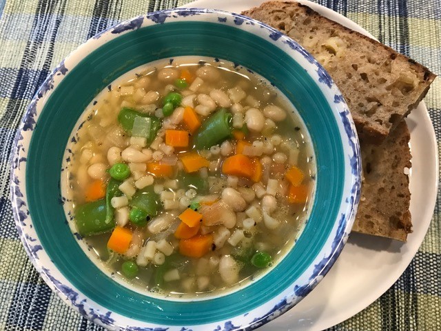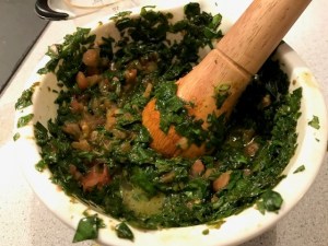 While the vegetables cooked, I made pistou (nut-less pesto) in my mortar and pestle. I’d never done that before, always using the power of the food processor instead of my own muscle. The result was much rougher but pleasing when dolloped on top of the soup.