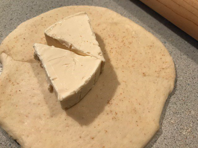 Finally, I found a day where the timing would work to make these flatbreads to accompany soup for lunch. Minimal work is required to prepare the dough, especially when using the stand mixer. Most of the time is spent waiting for it to rise. The dough was supple and glossy (from the butter) and rolled out easily. I was skeptical after wrapping the first flatbread around the cheese. Roll out this brick? The cheese is so soft that it was no problem. Surprise!