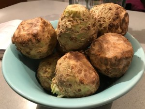 Celery root aka celeriac, that gnarly gritty bulbous vegetable. Celery root is rather intimidating to look at, but inside is an ivory root vegetable that’s a savory treat. As the name implies, celery root and celery are related. They are two different forms of celery. In the case of celery root, its variety has been developed for the edible root. The stalks and leaves are edible too, chock full of celery flavor, though typically the stalks are spindly, not substantial, the way a head of celery grows.