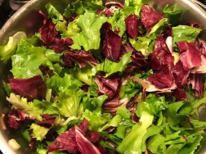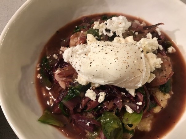 A mix of radicchio and escarole is braised until wilted. I was a little disappointed that the vibrant colored greens turned a shade of gray when cooked. Pan-fried slices of herby sausage and some slivered olives bulk up the topping. The final bowl is sprinkled with some feta cheese and topped with a poached egg.
