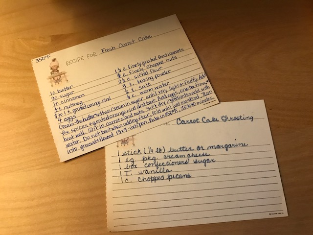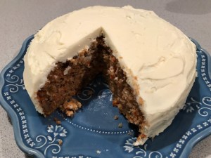 While I can’t say carrot cake will make frequent returns to my kitchen, I did like this recipe enough to make it again. Revisiting my mom’s recipe, I think adding orange rind to this recipe could only improve it. I noticed she added nuts to the frosting AND the cake. That might be an interesting variation as well. And for minimal fuss, I would even try baking it in a 13×9 pan.