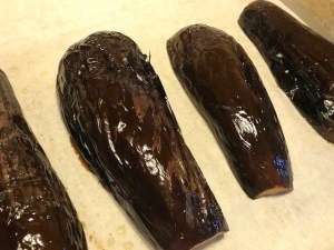 This week’s cooking challenge for Cook the Book Fridays Baba Ganoush (or moutabal, in French) fits perfectly in a sane cooking strategy for a hotter-than-hell week as it involves minimal cooking. Howard charred the outside of the eggplants while the grill was fired up for some burgers. The eggplants finish cooking in the oven. After that, all the ingredients were pureed in the food processor for a wonderful dip to scoop up with pita chips for a snack or part of lunch. Howard tried it, but as you know, eggplant’s not his thing. I, on the other hand, really enjoyed this version of baba ganoush. The recipe makes a generous amount, so one eggplant’s worth (half) might have been enough.