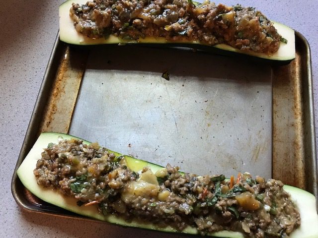The first assignment for August was Stuffed Vegetables. David Lebovitz suggested stuffing zucchini, eggplant, and tomatoes. Given that Howard doesn’t eat zucchini or eggplant, and even if I were filling a tomato, that filling contained the dreaded zucchini and eggplant, I had to get creative. Actually I wasn’t that creative. My solution was to scale back and stuff one zucchini just for me. The filling was delicious! Ground beef was extended with diced zucchini, eggplant and tomato along sautéed onion and garlic and lots of herbs. An egg binds the mixture together. I filled both halves of a single zucchini for two satisfying lunches for myself. The filling would be delicious in stuffed pepper, though I’d have to keep quiet about the full list of ingredients…