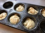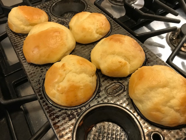 Knowing I was the only eater, I halved the recipe. What I set aside for the first rise was much more like batter than dough. I didn’t know if that was a result of halving the recipe or some other mistake. It did rise, and once the softened butter was whipped in, it miraculously transformed into a soft, sticky dough. The little cakes rose again, quickly (less than an hour). My kitchen in the summer is a very warm place.