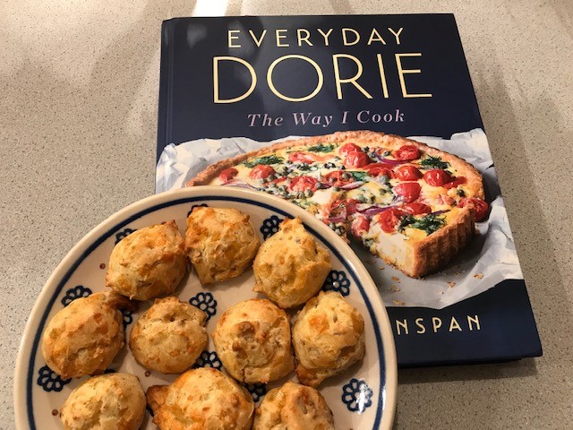 The inaugural recipe I made from Everyday Dorie is My Newest Gougères. “My” is Dorie’s voice, not my own. For those not versed in French food words, gougères are best described as savory cheesy cream puffs. They are made with the same pâte à choux dough as cream puffs with the addition of grated cheese, and in this “newest” version, toasted walnuts and some Dijon mustard.