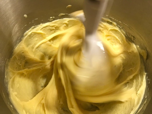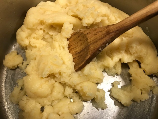 Next, you beat in eggs (a stand mixer is best) one at a time, leaving you with a sticky dough. Finally, you add the cheese, mustard, and nuts.