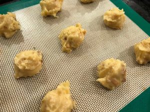 Finally, scoop the dough onto parchment- or silicon-lined baking sheets. I used a small scoop which yielded 6 dozen puffs. We didn’t have any guests, so I baked one dozen to snack on before dinner. The gougères were light and airy. The nuts added a welcome bite.