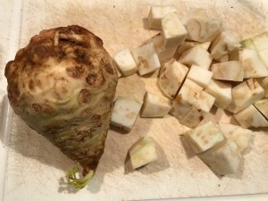 I’m always surprised that an ugly, gnarly vegetable as celery root can be transformed into a puree that’s an interesting side dish sort of like mashed potatoes, but not quite. I still had a few bulbs of celery root from my fall CSA languishing in my fridge, so no sourcing challenges on this one.