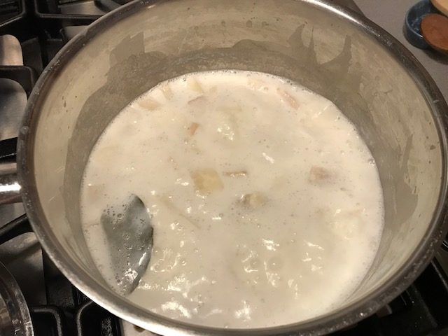 This was easy enough to make, but I’m not completely sold on the idea of cooking the vegetables in milk. I have an aversion to milk on many levels. I’m the person who, when eating a bowl of cereal, will drain all the milk off the spoon before each bite. When the milk disappears into the dish, like in a cake or even a soup, I can deal with it. However, using milk as the liquid vehicle for cooking the celery root and potatoes, it got so curdy and rather repulsive to look at. I won’t be doing that again.