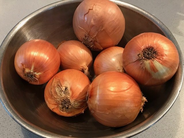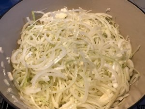 French onion soup is one of those soups where the quality of the underlying broth is key. David’s version calls for chicken broth. I had a turkey carcass in the freezer which was close enough. I got a start early in the week, making a batch of turkey stock in the slow cooker. I love making stock in the slow cooker. I can comfortably come and go while it simmers away safely without any attention required. And when I do leave the house, the aroma on returning is magnificent.