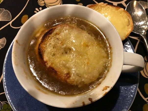 I eat a lot of soup in the winter, making a pot once or twice a week depending on what’s on hand and my mood. A few favorites are periodically repeated, but there are so many soup recipes out there, more often I try something new. Of course, “something new” could be a different recipe for something I know we like. French Onion Soup falls under that category. This week’s selection for Cook the Book Fridays is David Lebovitz’s version of this classic soup from his book My Paris Kitchen.