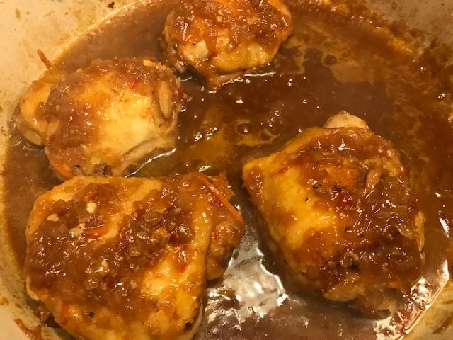 After the chicken is browned, the onions get added back along with chili sauce, soy sauce, Dijon mustard, and Sriracha and the mixture simmers, mostly unattended, until the chicken is done. In my case, with the occasional basting, this took only 20 minutes.