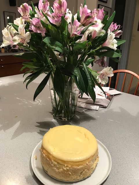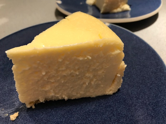Once adequately chilled, I cut slices for tasting. Sadly, the texture wasn’t what I’d been anticipating. It wasn’t at all dense. Howard even described the texture as feathery. I’m not sure whether the issue is the recipe or me. Admittedly, I made a half recipe, baking it in a 6-inch pan. I winged it on the cooking time adjustments. For the initial baking step, there weren’t any clues to doneness in the recipe. I reduced the baking time from 70 minutes to 55 minutes. After that, it took an hour-and-a-half for the center to be set but still jiggly. And even though the texture isn’t what I was hoping for, maybe it’s the way the recipe is meant to be. Hard to know.