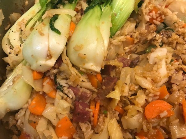 In the spirit of Dorie’s fridge raiding, I tweaked her recipe for Ginger Fried Rice to mostly match what I had and was delighted by the result. I did purchase baby bok choy, but otherwise, I had the other ingredients around. I cooked the rice in the morning and put it in the fridge for the day so it was “leftover” by dinner time. I used a leftover soy dipping sauce for the ponzu and thawed some frozen corned beef from a past St. Patrick’s Day to add some protein. The dish was so simple to throw together.