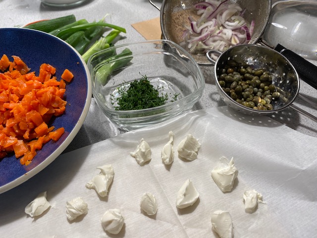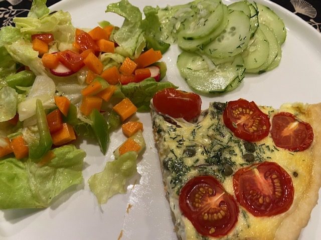 I hope that Nana had a chance to make this tart on her own schedule because it is so delicious! Certainly whenever I make this again, I will think of it as “Nana’s Bagels-and-Lox Tart”.