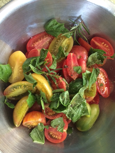 The cherry tomato topping was also fabulous. My cherry tomato has been slow to ripen, but I found a colorful assortment at a local farm. The sweetness of the cherry tomatoes concentrated during roasting and melded with the fragrant herb sprigs for a meltingly wonderful mélange.