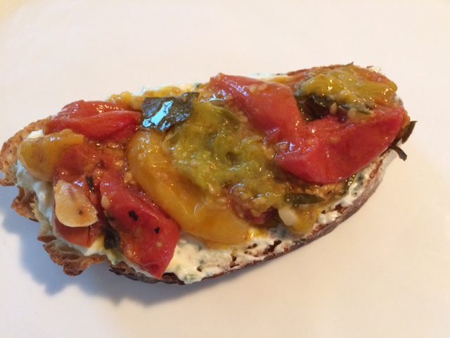 Toasted rustic bread (I used ciabatta) is the base for a layer of herby cheese crowned with roasted cherry tomatoes. It’s summer on toast.
