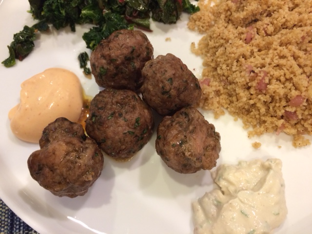 This recipe is intended as an appetizer, but I decided to turn it into a meal. For carefree cooking, I ended up baking the meatballs while I prepared the rest of the menu. The North African meatballs with the two sauces were delicious with couscous and sautéed greens on the side. All the different flavors came through. The meatballs were moist and complex with a bit of a kick, but not too spicy.