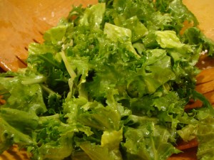 Tear chicory and romaine into 1-inch pieces. Toss the greens with enough dressing to coat. You might not use it all.