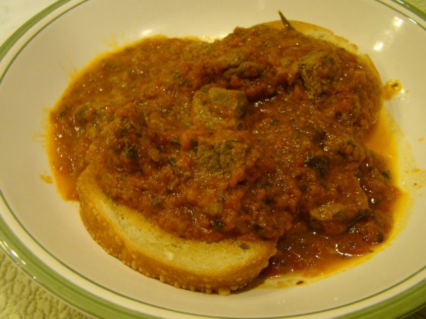 Fortunately, I made some pre-storm beef stew which was a wonderful, hearty meal. This was different from a typical beef stew. First, I made a chunky tomato sauce, then simmered browed beef in the sauce until tender. The recipe called for serving the stew over garlic toasts, which I did. I served leftovers over egg noodles, which I preferred. The recipe serves 4, but they aren’t generous portions for most eaters. If you’re making for hearty eaters, you might need to double it. A bitter salad, with a mix of chicory and romaine tossed with garlicky-anchovy dressing, was the perfect accompaniment.