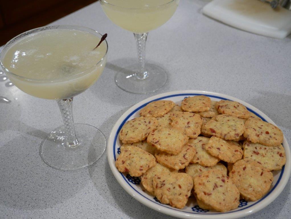 I sliced-and-baked one log, which we nibbled alongside the evening’s cocktails –Corpse Reviver #2 – a pre-Prohibition cocktail we discovered during last year’s trip to Florida. It’s one of our favorite house cocktails now. I thought I’d freeze and save the other log for another night, but we scarfed them up. The other log is baking in the oven now.