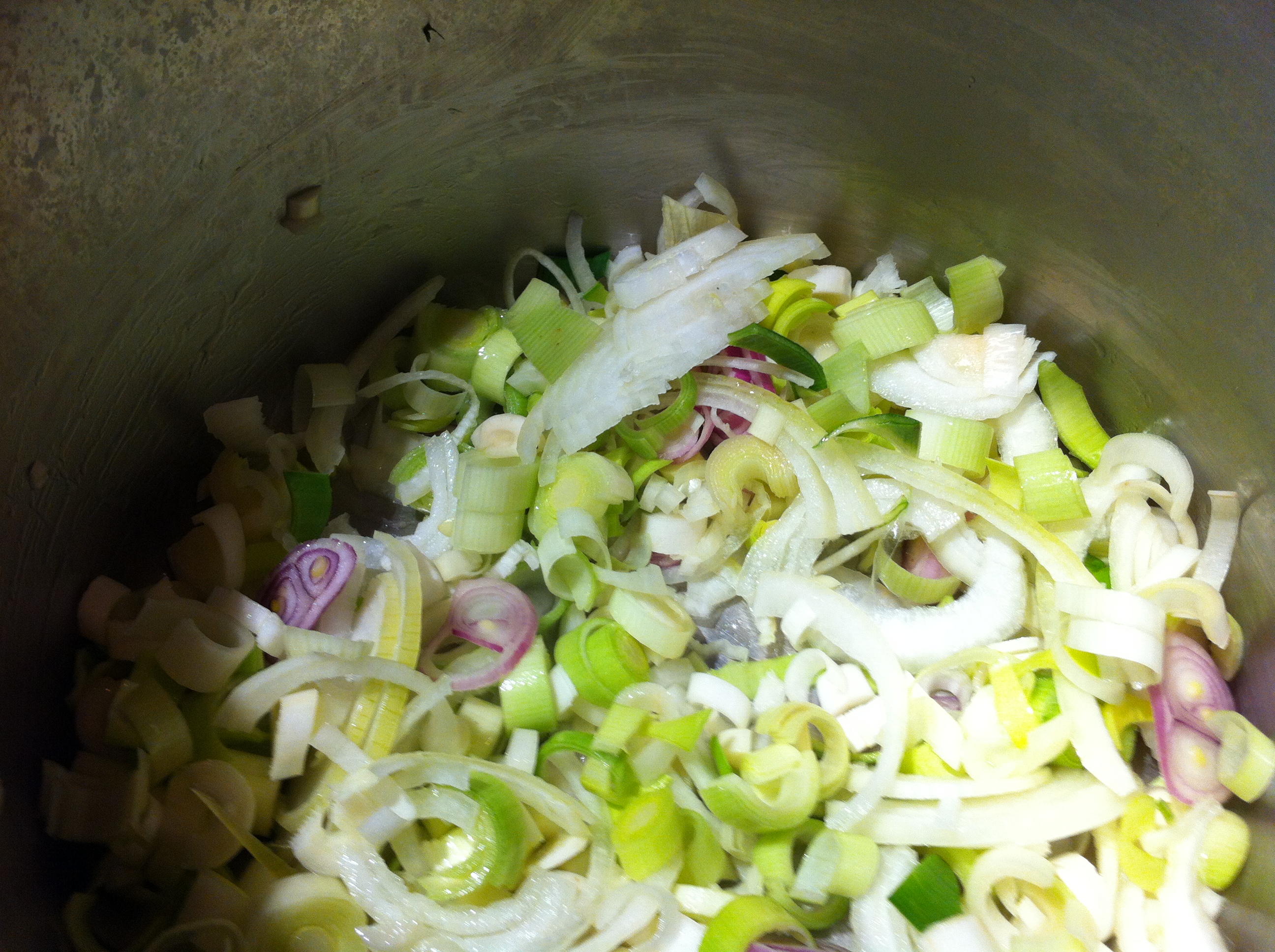 That left me without the peelings to make the quick stock base from. I took a different tactic. I put the woody ends, and the dark green tops of my leeks, plus the peelings of five stalks of asparagus right into a pot (no wrapping in a cheesecloth, another fussy step), covered them with salted water, and boiled it for a few minutes. Then, I strained out the solids. The asparagus stalks themselves needed a quick cook too, so I brought the stock to a boil again and cooked the asparagus as the recipe called for. From there, I followed the recipe as written.