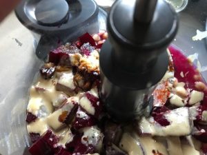 All the ingredients are pureed in the food processor. The most time-consuming task was roasting a beet. The usual suspects in hummus were part of the ingredient list (garlic, lemon, chickpeas, and tahini), but to be honest, the beet overpowered it all. While the color is fun, I found the flavor to be cloyingly sweet. I forgot to sprinkle the top with some za’atar, which might have changing the mix.
